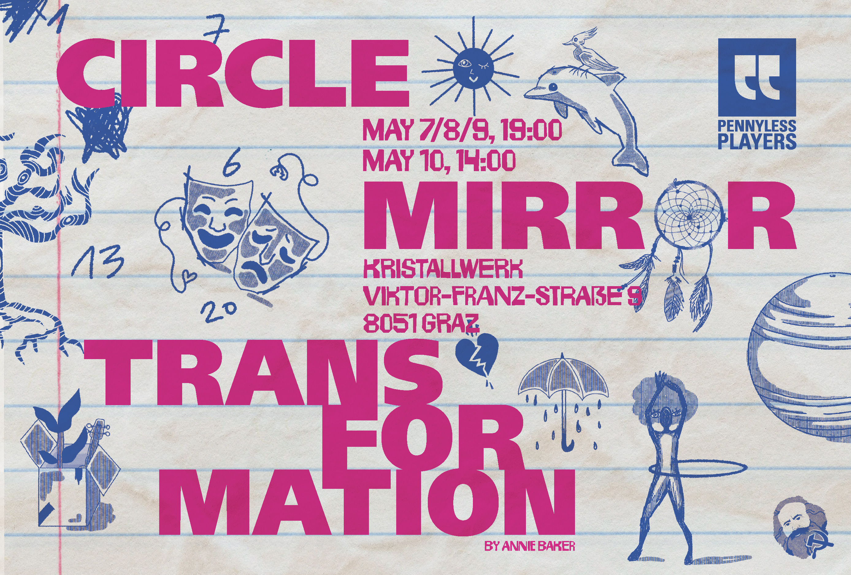 The time has arrived to officially announce The Pennyless Players’ next big production. This May we are returning to Kristallwerk with Circle Mirror Transformation by Annie Baker. Join us for this modern play about the beautifully “normal” journey of being human: a diverse and relatable cast going through self discovery with the help of acting exercises and eachother.